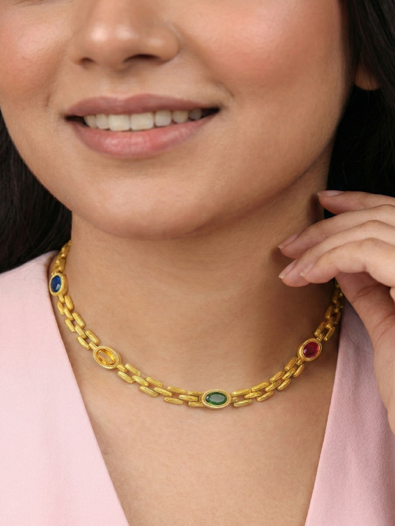 The Aawari Gems Link Chain embodies the spirit of dressing up for confidence. Chunky gold links meet vibrant gemstones in a design that is both bold and timeless. This is a striking piece made for standout moments.
