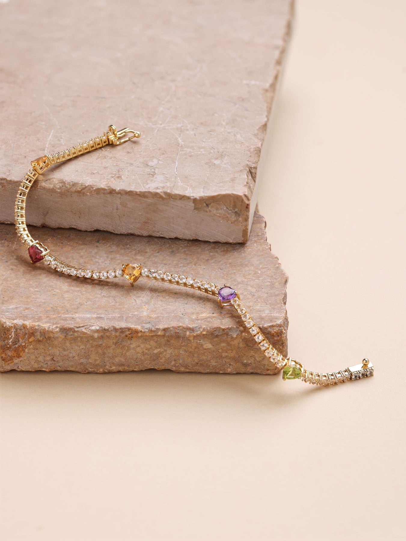 A gentle reminder to carry colourful joy with you, always. Each heart on the Titli Hearts Bracelet reflects a unique gemstone, a different mood, coming together in a piece that glows with quiet joy and effortless charm.